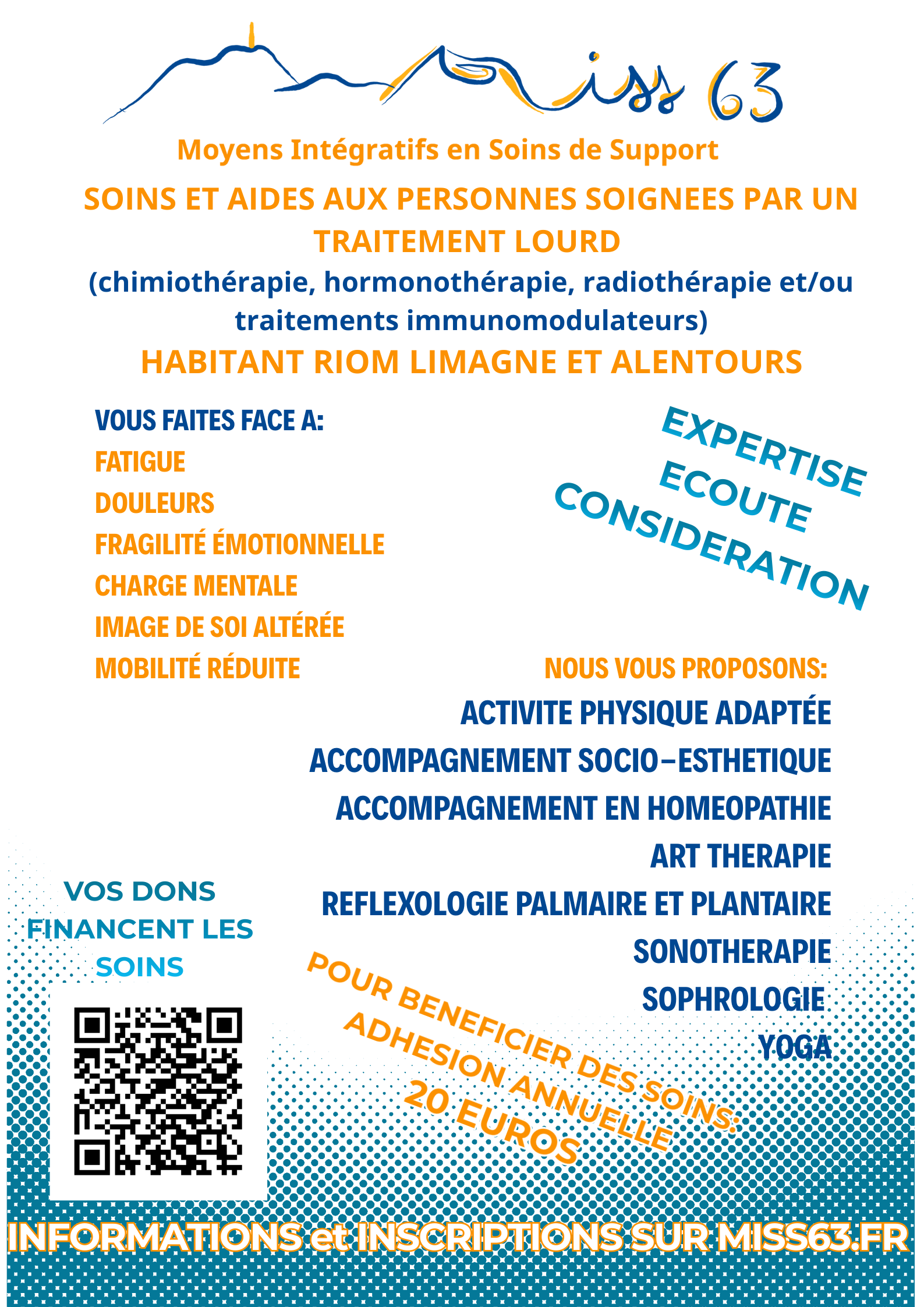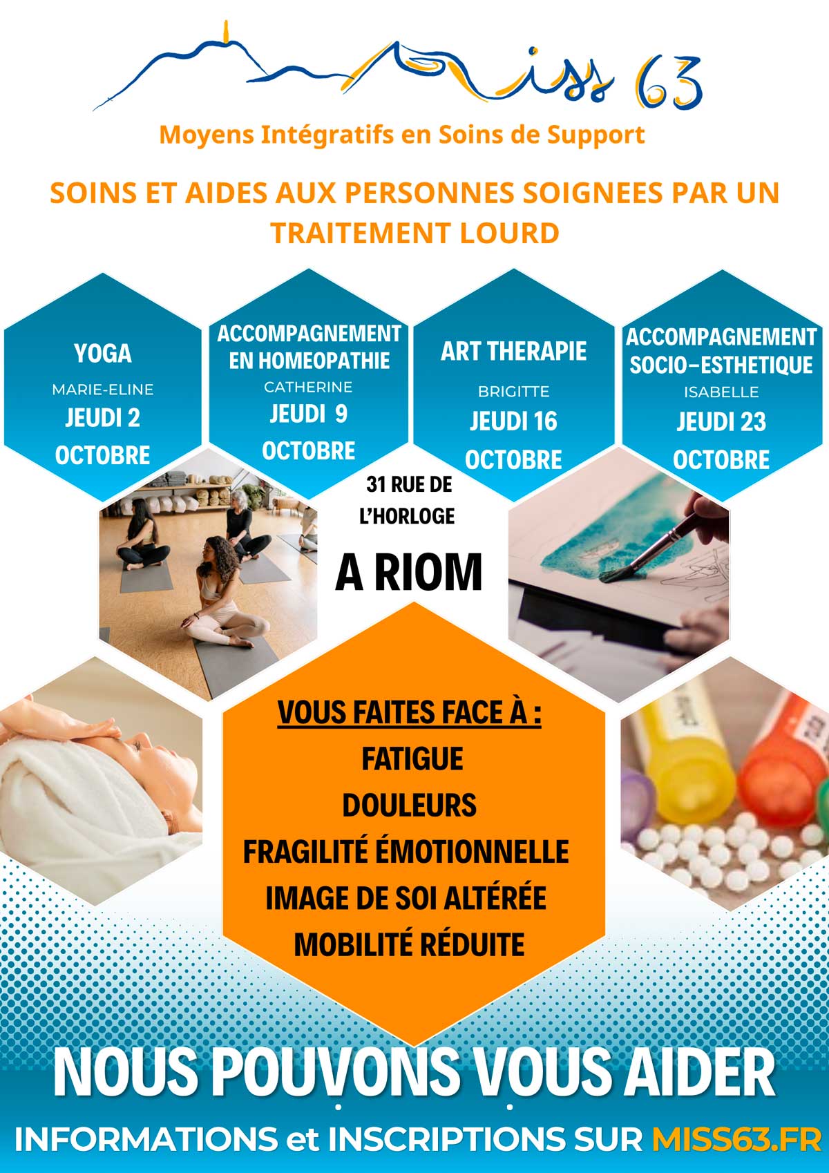 Fortes de ce constat, nous avons décidé de créer MISS63 (Moyens intégratif en soins de support), association qui propose des soins de support variés à Riom prodigués par des praticiens compétents.