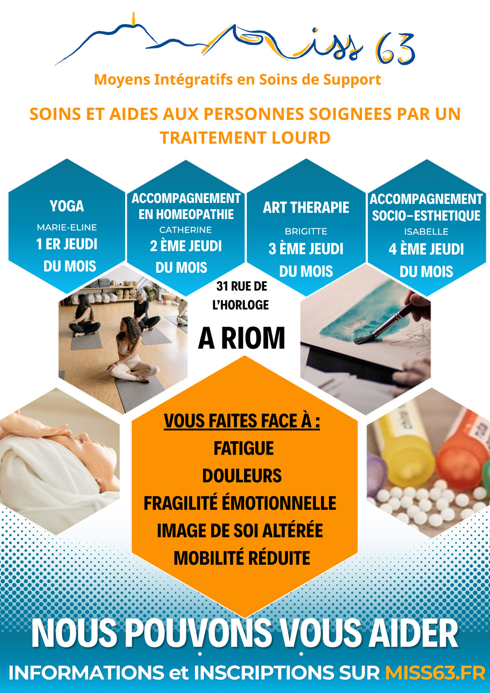 Fortes de ce constat, nous avons décidé de créer MISS63 (Moyens intégratif en soins de support), association qui propose des soins de support variés à Riom prodigués par des praticiens compétents.